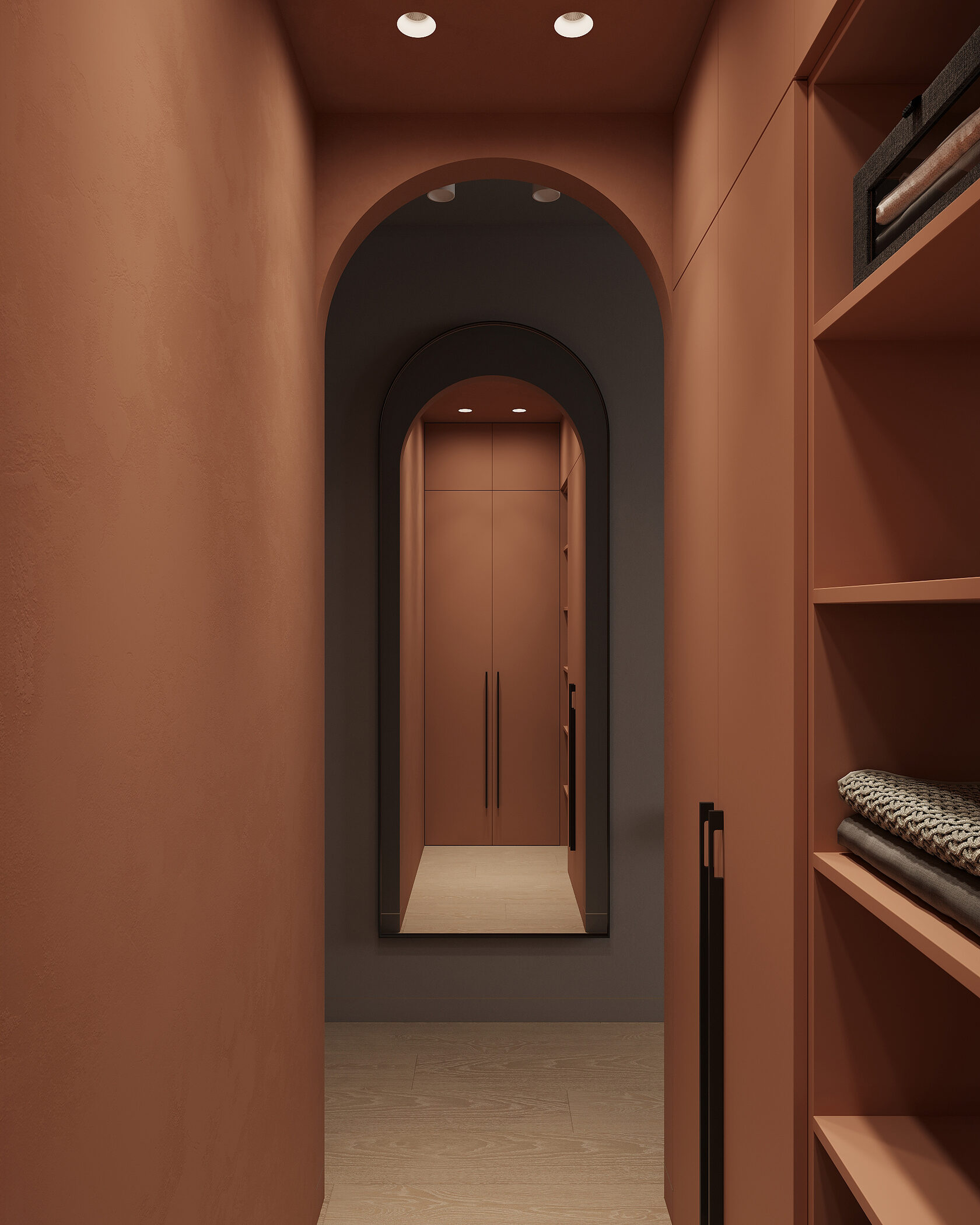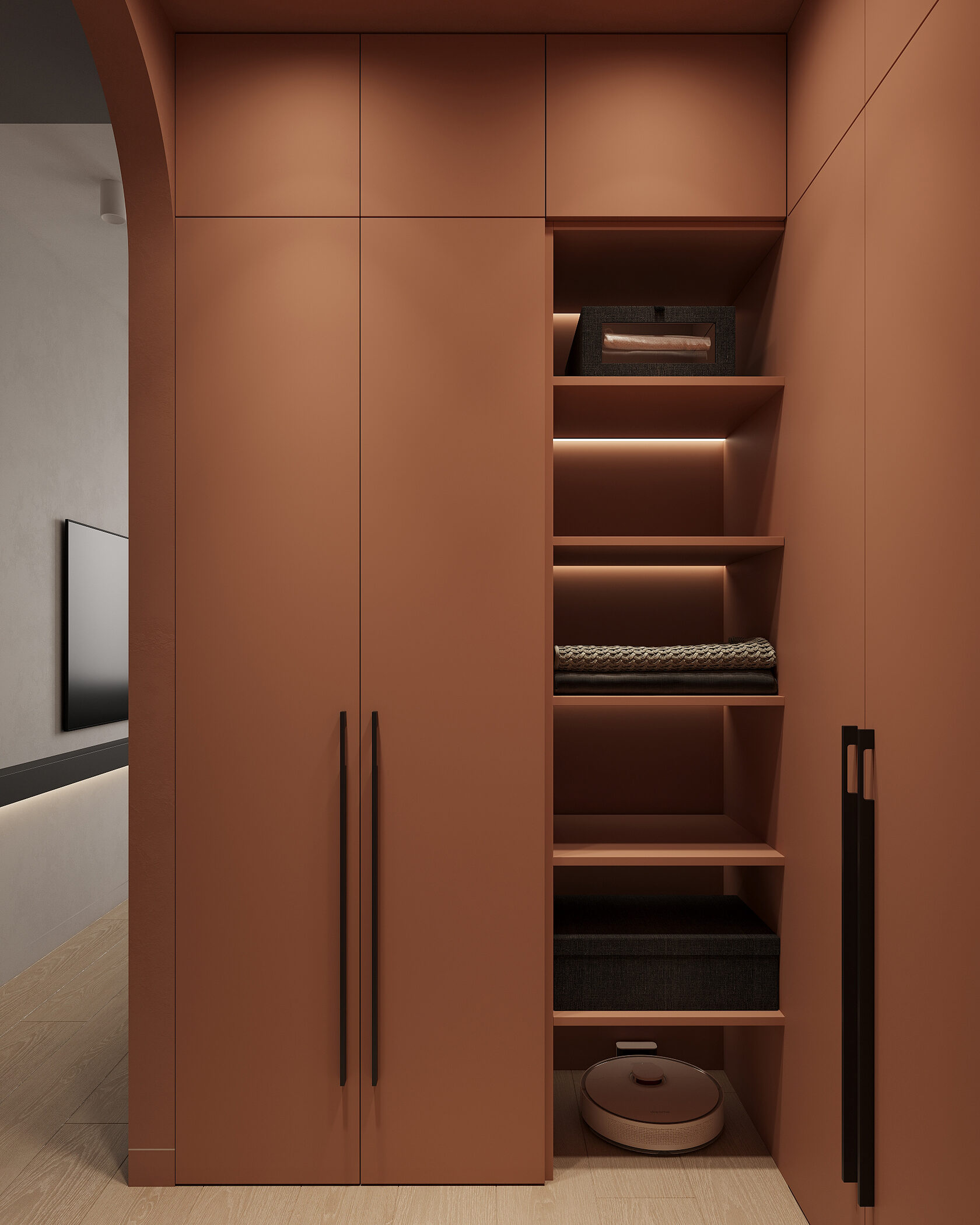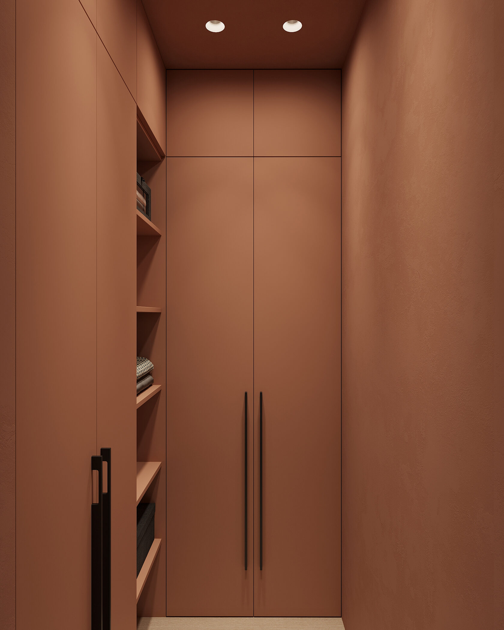 Терракотовый цвет наряду с другими землистыми тонами призван наполнить дом атмосферой уюта и безмятежности. Так, в проекте данной квартиры, этот одновременно спокойный и насыщенный оттенок выбран акцентным в интерьере зоны хранения.