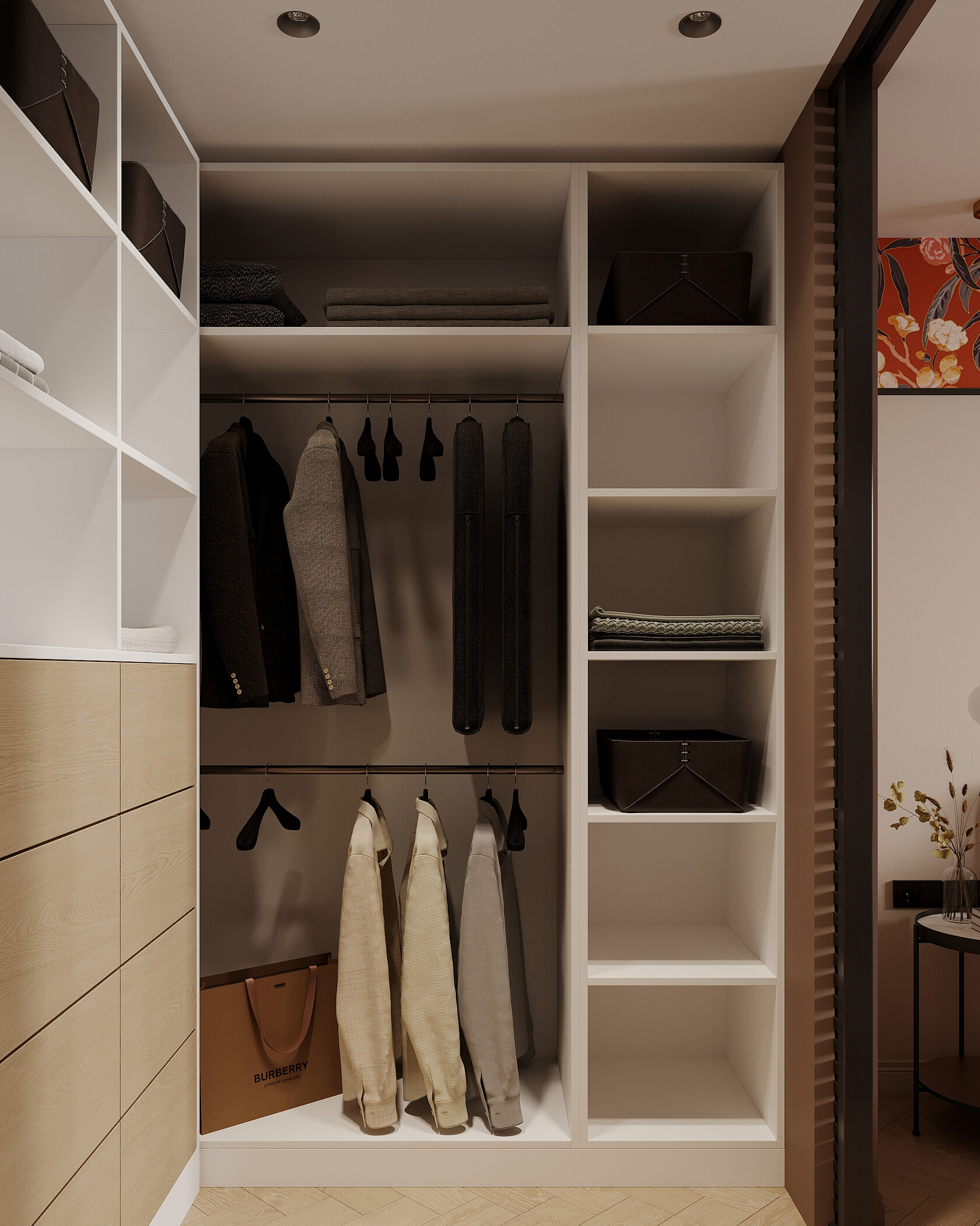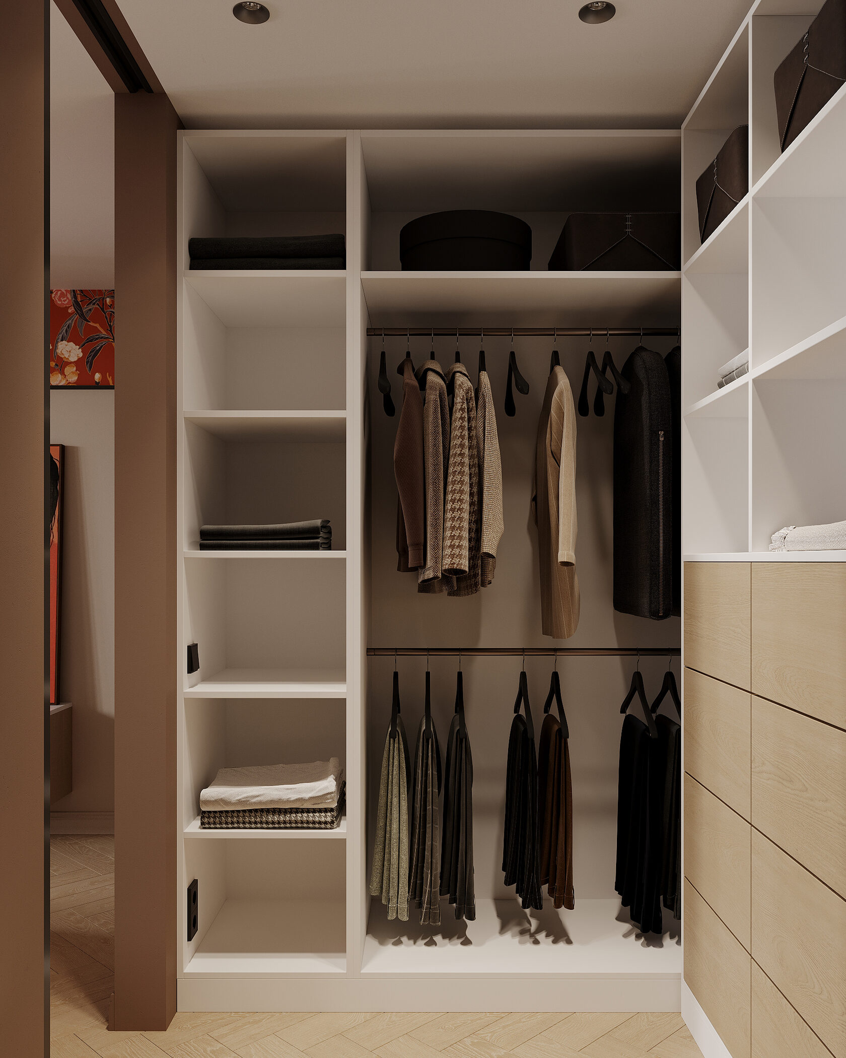 Цветочный рисунок на полосе обоев под потолком, терракотовый цвет и другие землистые тона призваны наполнить спальную зону атмосферой уюта и безмятежности.